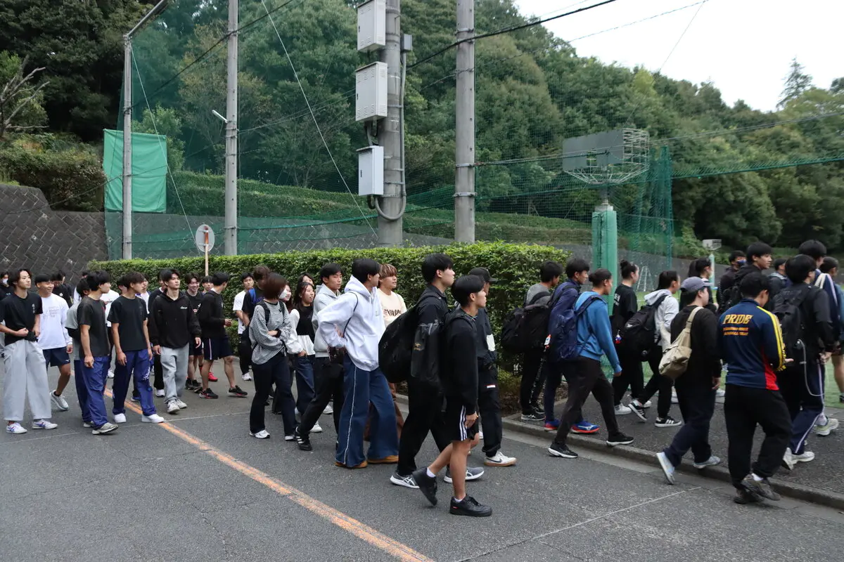 学生は個々人および集団行動時の安全確保を遵守しながら移動し、避難ルートの確認を行いながらラグビー・アメリカンフットボール場へ避難しました。