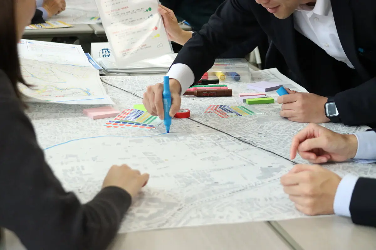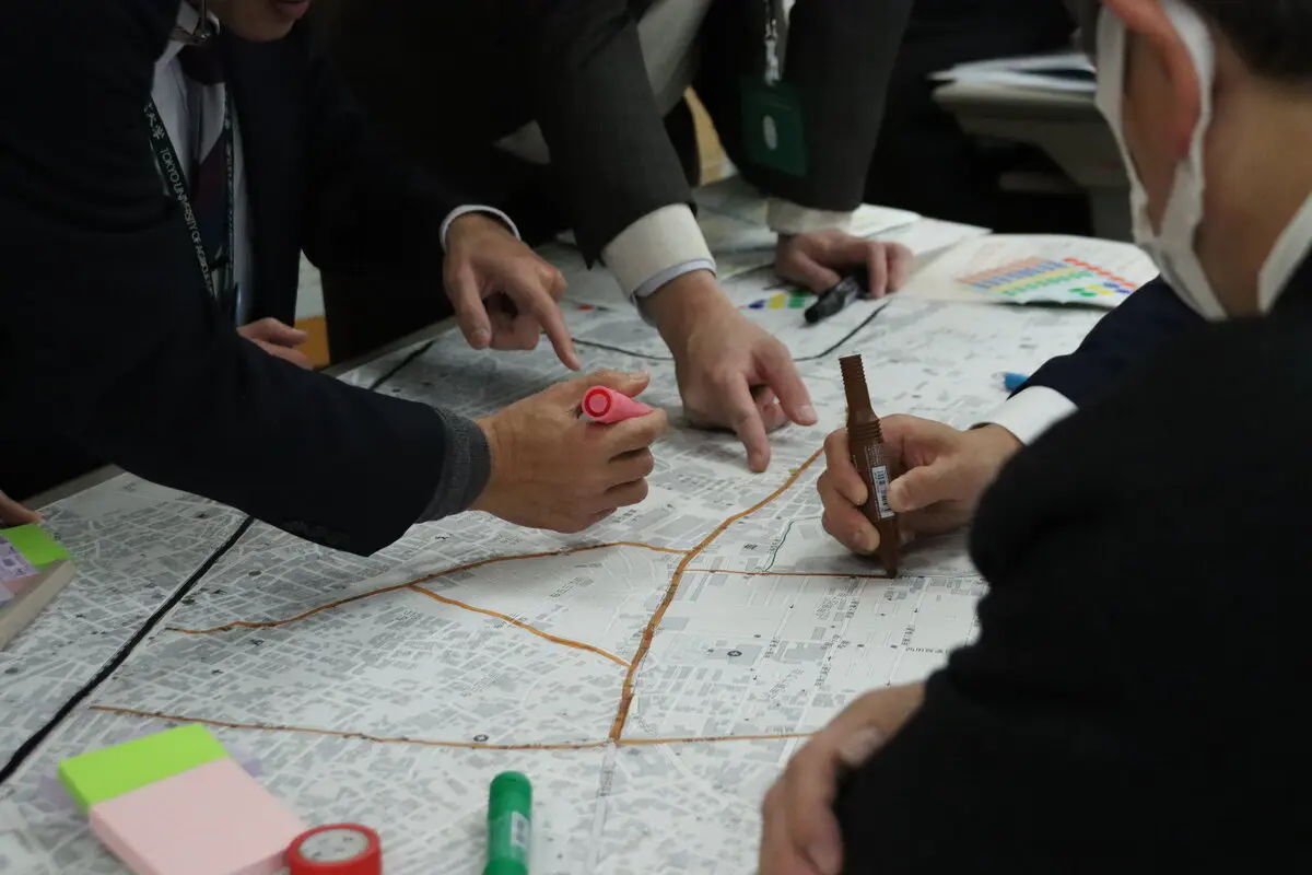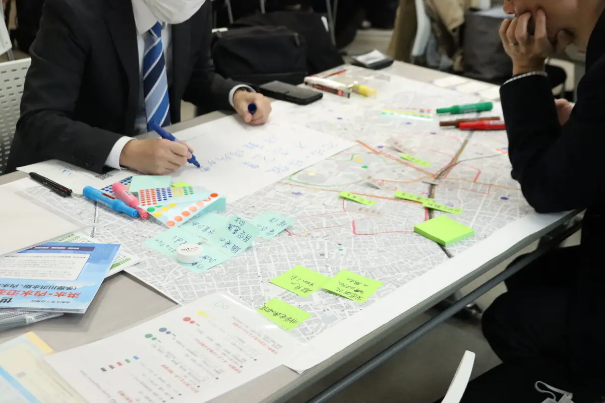 はじめに、世田谷区全体に加え、各大学が立地する周辺地域の施設や建物について再確認するとともに、災害時に予想される危険箇所、支援を必要とする場所、災害時に活躍する機関など、各部門ごとにペンやシールで色分けをし可視化する作業を行いました。その後、それらの場所で発災時に想定される事故や被害、自然災害などについて意見を出し合いました。