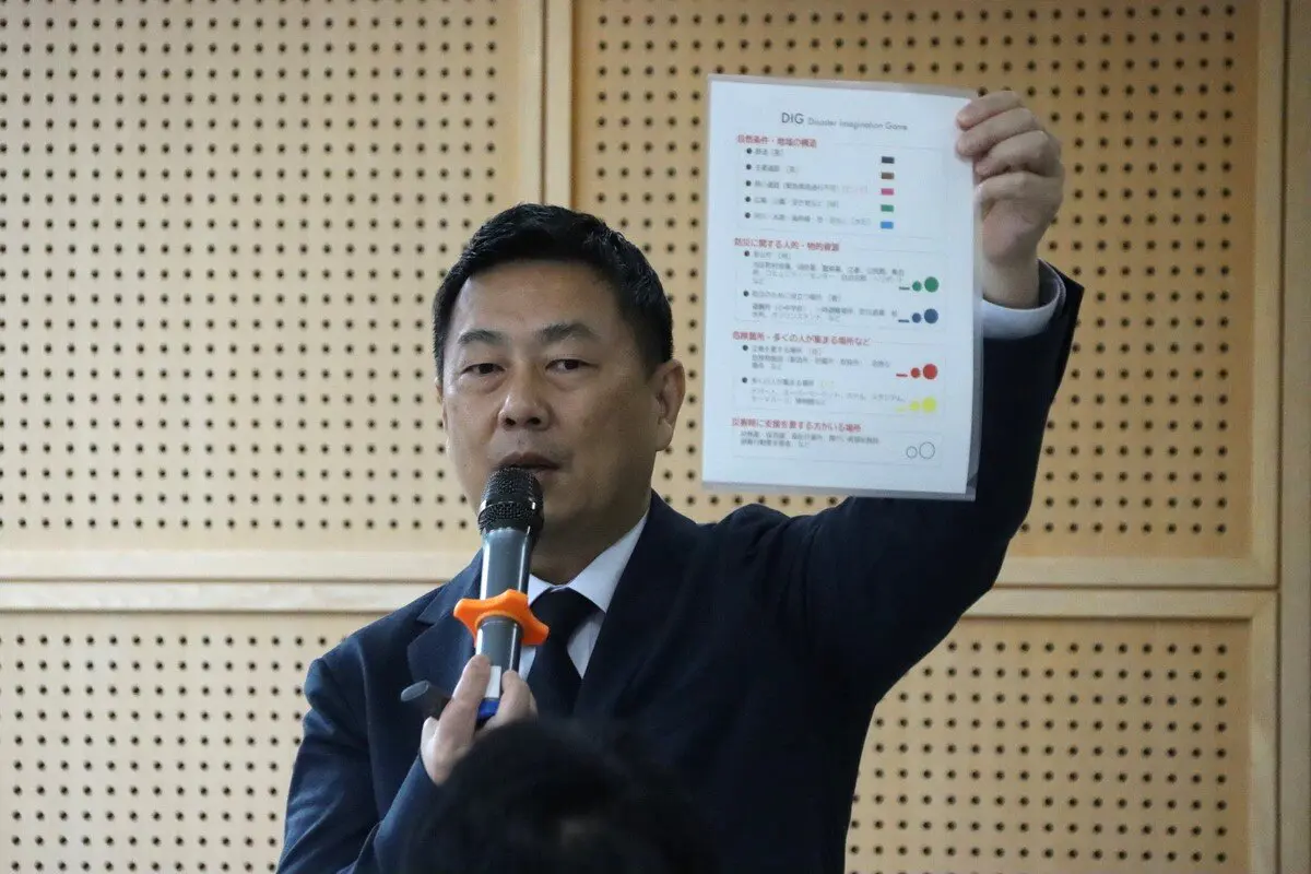 本学防災・救急救助総合研究所の石﨑貴准教授が講師を務め、今回は「DIG」と呼ばれる大きな地図を使用した災害図上訓練を行いました。