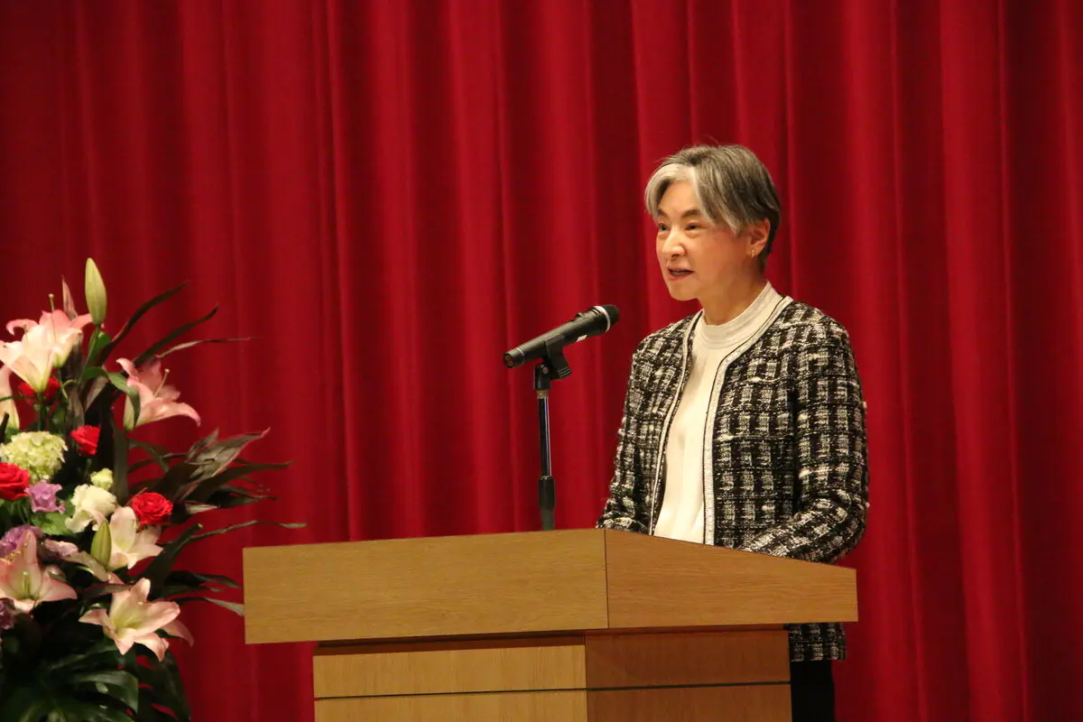 次に、会場校代表として本学から田原淳子学長が壇上に上がり、60周年の節目に記念式典と懇親会の会場校になったことは大変光栄であると述べました。また、会長校と三役員、常任校の方々へ謝意を表すと共に、3年前に本学が会長校として通常総会と講演会を行った際のエピソードに触れた上で、これまでの連携に感謝の念を伝え、「本日が皆さまにとって有意義な時間になるようお祈り申し上げる」と歓迎の言葉で締めくくりました。