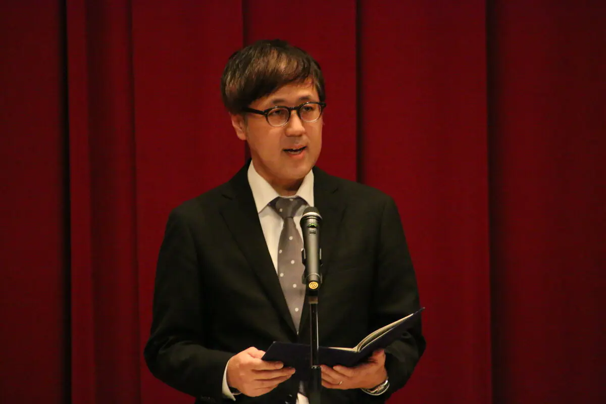 続いて文部科学省高等教育局学生支援課の奥井雅博氏が生連協のこれまでの取り組みについて言及し、60周年という大きな節目を迎えられたこと、この間継続して尽力された方々に対して、深く感謝の意を表しました。学生のバックグラウンドが多様化する中、学生支援業務が多様化・複雑化しており、相談しやすい体制構築、カウンセラーや学生支援関係部署との連携による一層細やかな対応が重要である、生連協の役割はますます増大していると認識を示しました。最後に、式典の準備に携わった本学関係者へ感謝を述べるとともに生連協のさらなる発展と来場者の活躍、すべての学生の成長を祈念し、謝辞を締めくくりました。