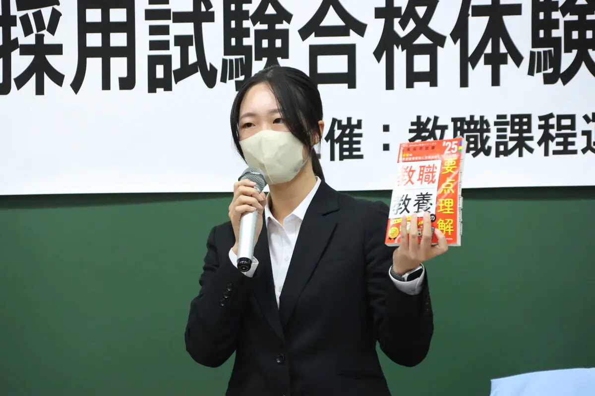 報告会で発表者は、各自の勉強方法や受験した自治体の試験傾向、試験勉強中に使用していた参考書、自作の面接ノートについて紹介したほか、勉強をする中で感じたことや、失敗・後悔したことなどについても触れ、採用試験の受験を控えた学生たちにアドバイスを送りました。