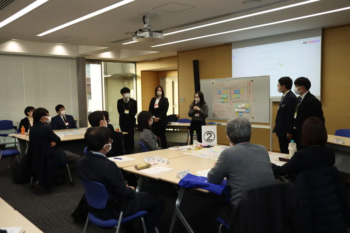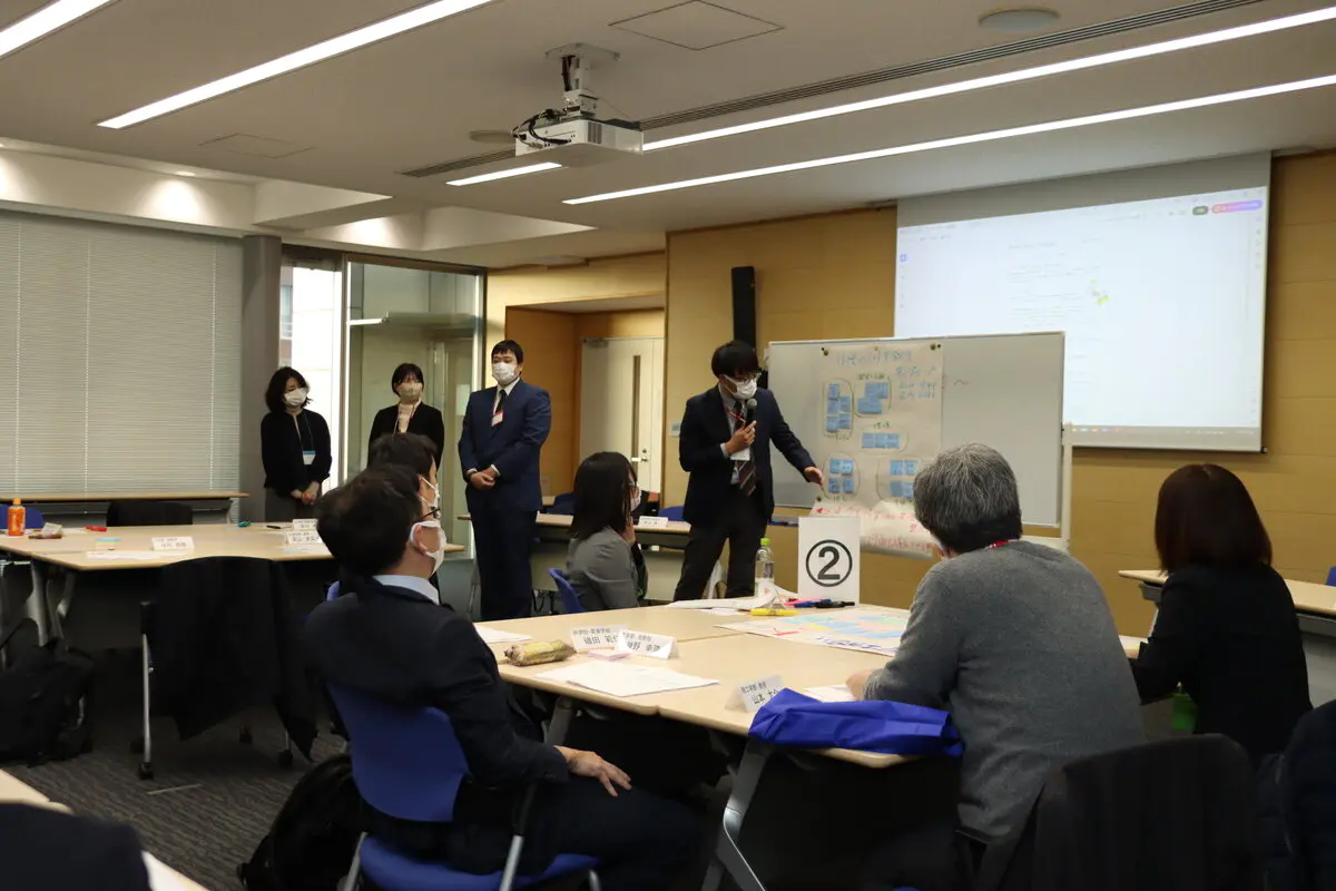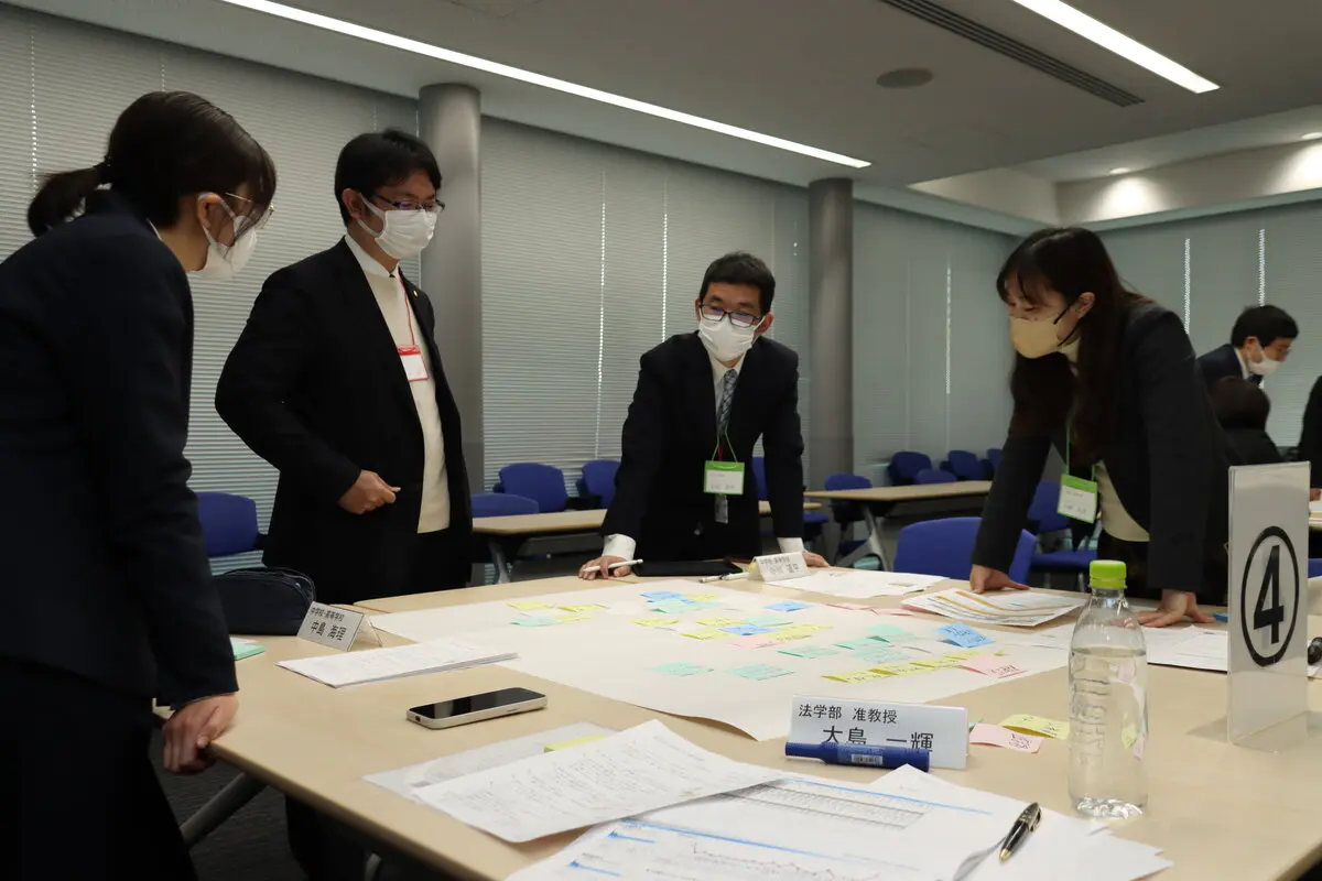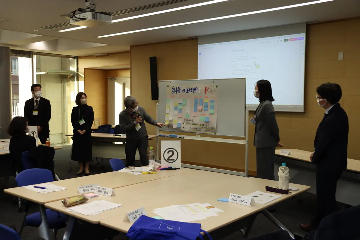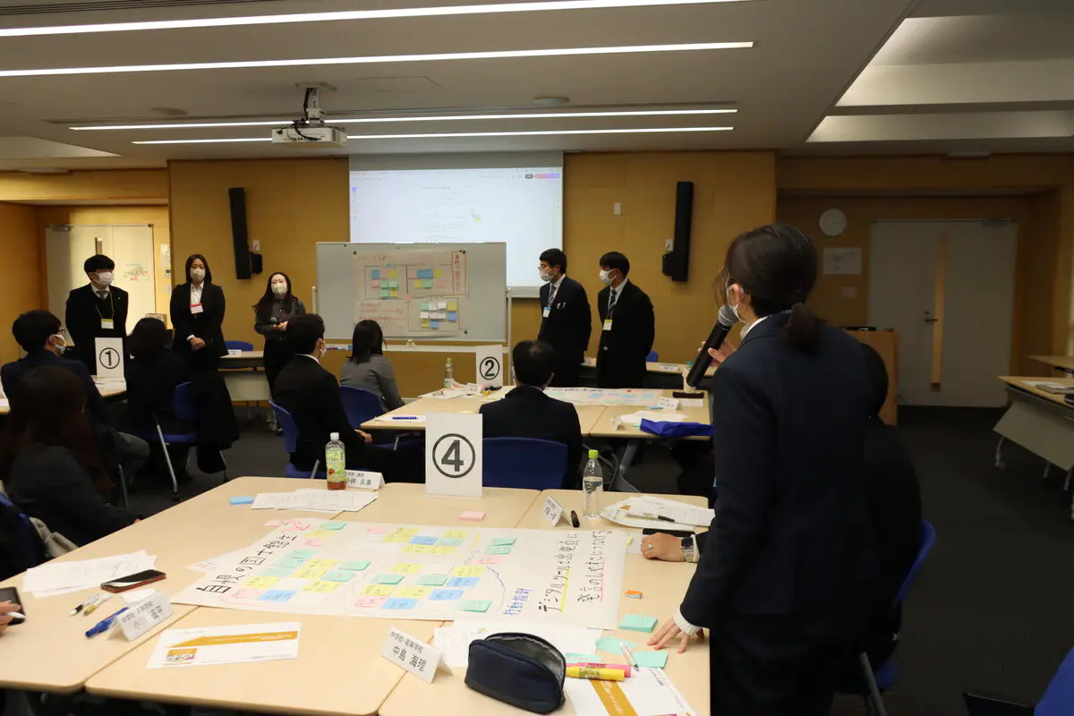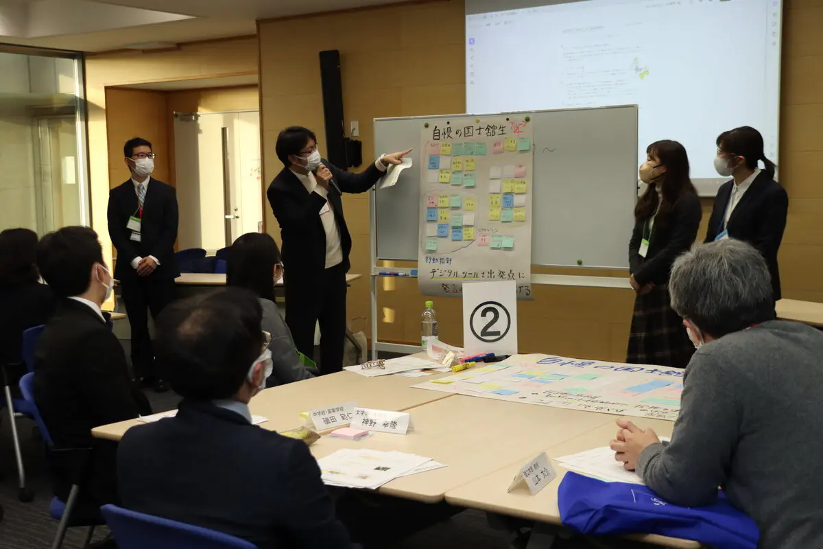 続いて行われた「自慢の国士舘生」と題したグループワークでは、研究分野や担当科目が異なる中、それぞれの教育現場で感じた国士舘の強みや課題について活発な議論が展開され、その強みをさらに伸ばすための取組について検討が行われました。グループワーク終盤では、各グループの検討内容を今後の行動指針としてポスターにまとめ、ポスター発表を行いました。発表では、グループワークでの成果や意見を発表するとともに、質疑応答を通して相互理解を図りました。