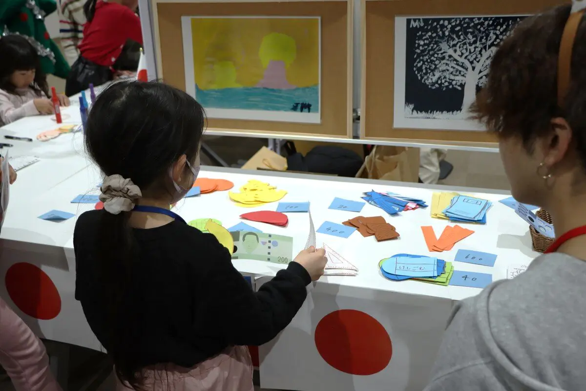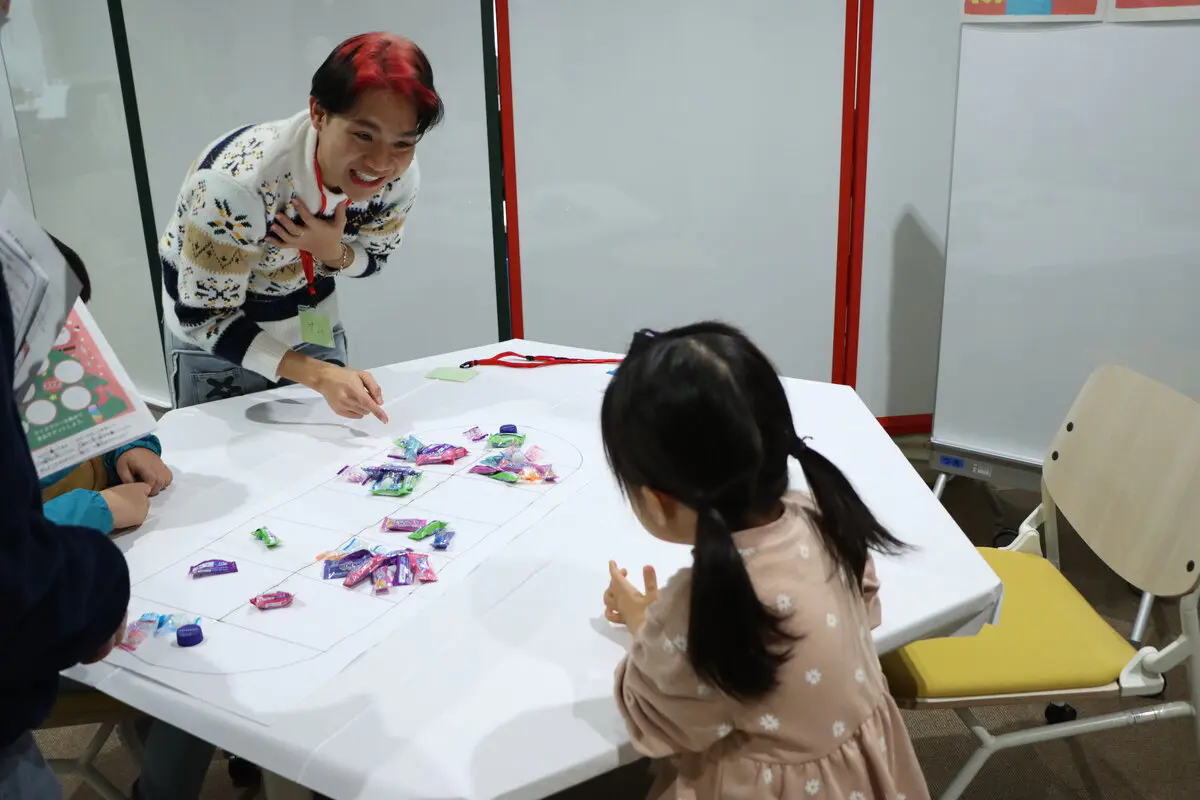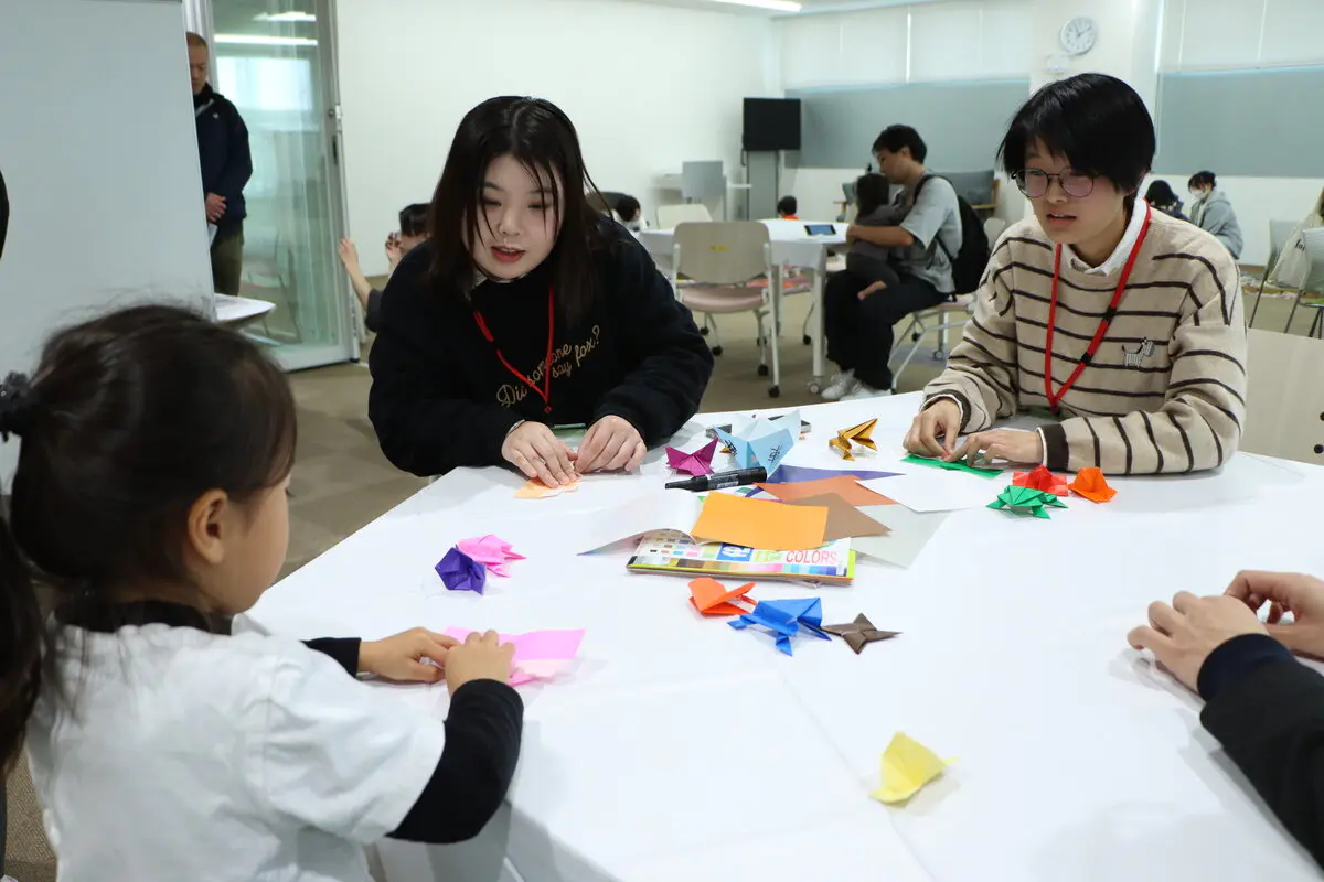 本ブースでは、本学に在籍する外国人留学生らが参加し、母国の遊びや折り紙を使って来場者と一緒に楽しむ活動を行いました。伝統遊びでは、ベトナムの「オー・アン・クアン」を実施し、留学生が来場者に遊び方などの説明をしながら、一緒に楽しみました。また、折り紙ブースでは留学生が教えるだけでなく、来場した子どもからも折り方を教えてもらう場面もあり、国境や世代を超えた交流が数多く見られました。