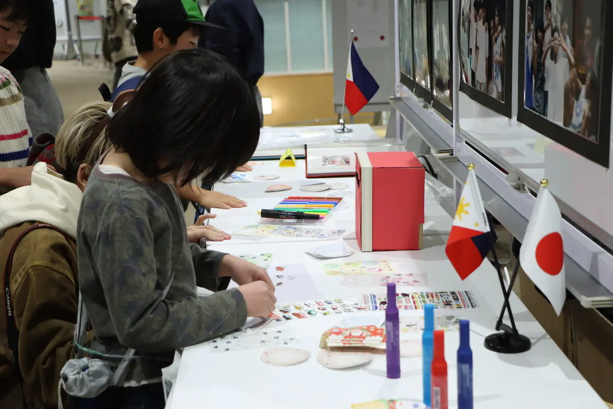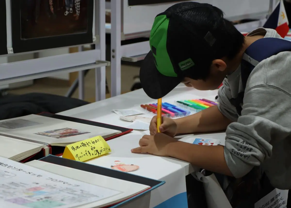 上村ゼミは、フィリピンの子どもたちが描いた絵画の展示と、フィリピンの子どもたちの様子を伝える写真の展示を実施しました。また、来場者からフィリピンの子どもたちへのメッセージカード作りを「夢をあきらめないサンタプロジェクト」題して開催し、合わせて11人の学生が参加しました。