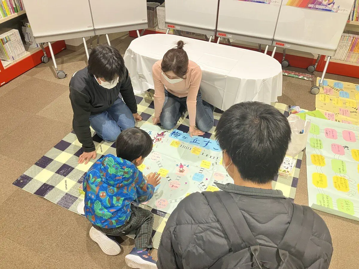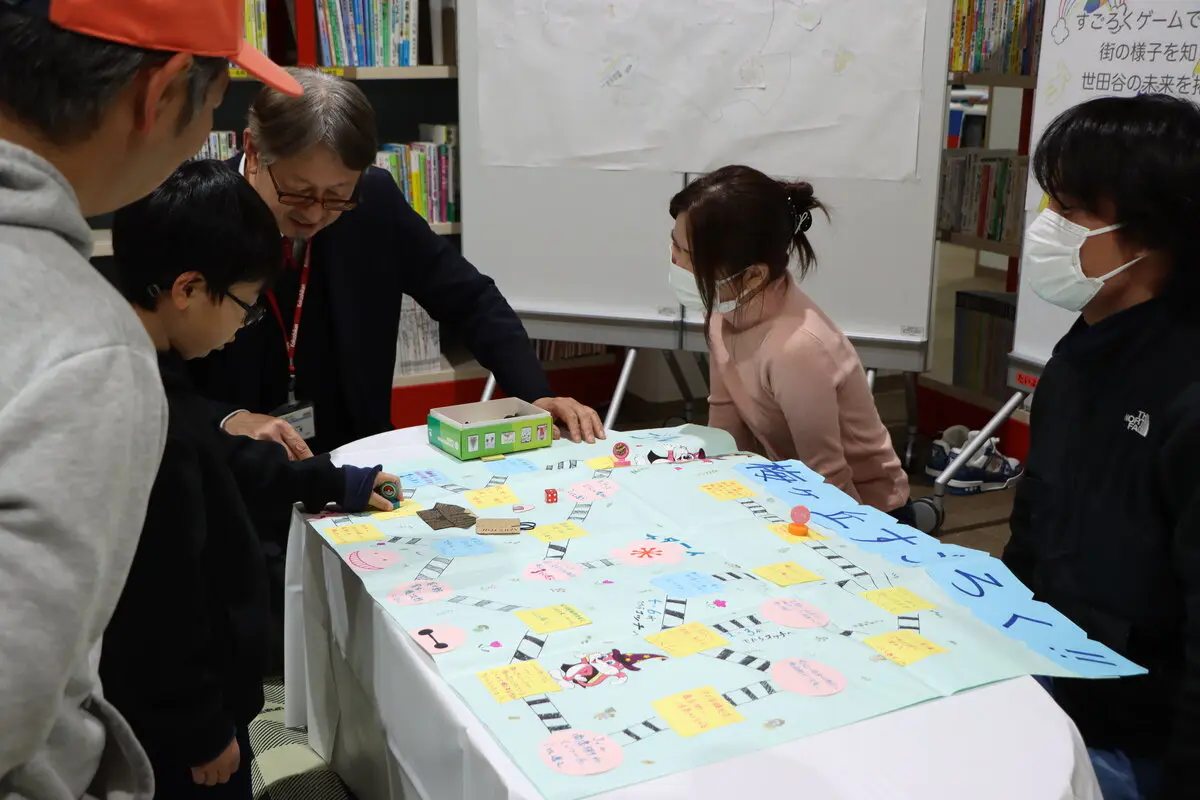 石見ゼミは、子どもたちが自ら参加して作る「体験型綿あめ」の運営と、梅丘および若林地区を題材にした「すごろく」遊びを実施しました。また、そのすごろく遊びを通して、世田谷がこんな「まち」になってほしいという思いを絵にする「せたがや未来マップ」作りを行い、4人の学生が参加しました。