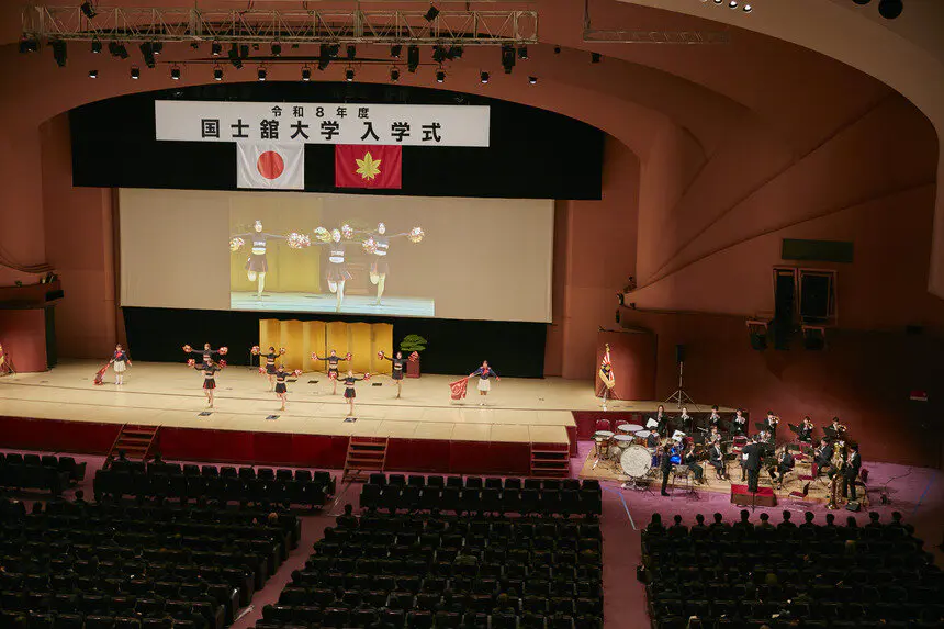 式終了後は、全体オリエンテーションとして、国士舘大学教育後援会の支援内容や障がい学生支援室で行う合理的配慮について紹介した後、本学防災・救急救助総合研究所の山﨑登名誉教授が、本学の防災教育について講演しました。最後に新入生に向けて、本学吹奏楽部、チアダンス部ELVESによる合同エールが送られ終了しました。