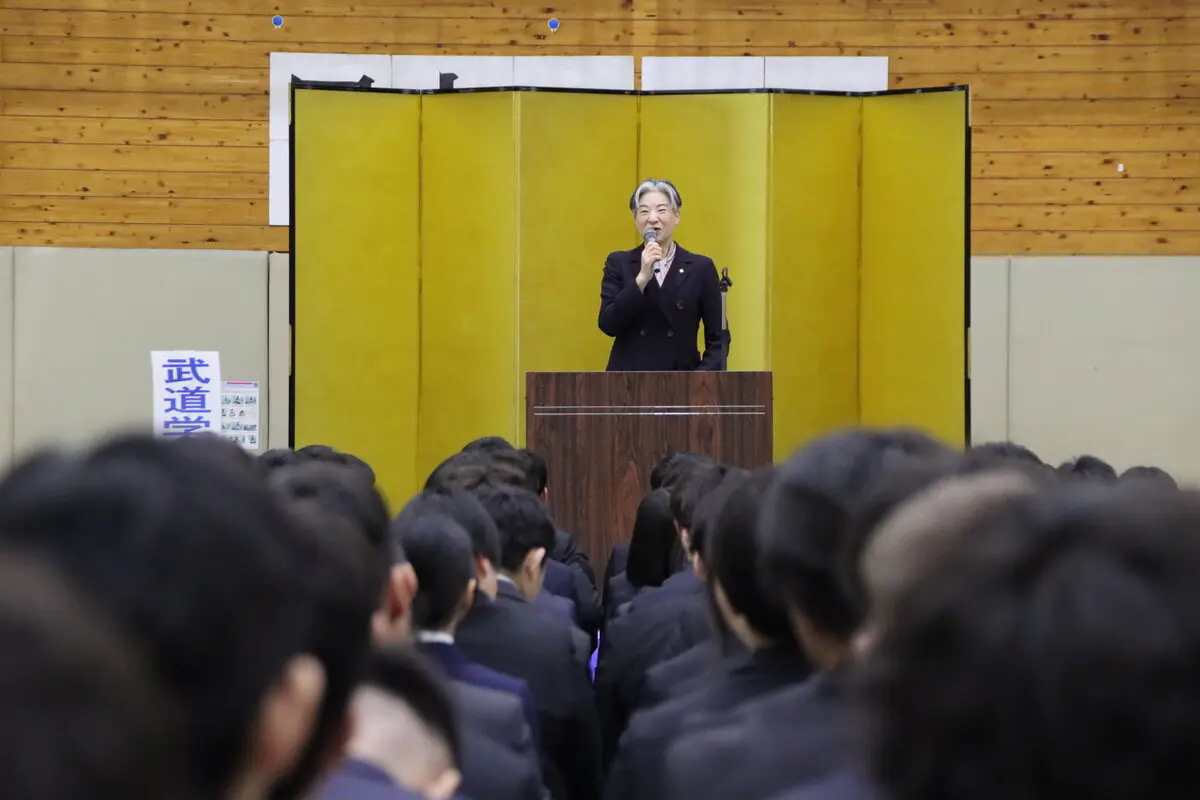 続いて、柴田が掲げた国士像「文武両道の精進によって、賢い、強い、そして優しい人にならなければならない」という言葉を引用し、建学の精神への理解と教育理念の四徳目「誠意・勤労・見識・気魄」の実践を呼びかけました。