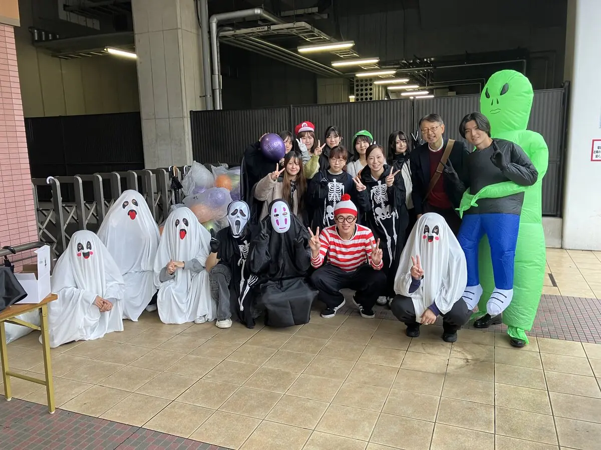 石見ゼミでは、3年前から梅まつりや夏の縁日など、梅丘商店街のさまざまなイベントに参加をしています。ハロウィン・イベントの参加は2022年、2023年、2024年度に続いて4回目で、2年生の基礎ゼミナール17人の学生が仮装をしイベントに参加しました。