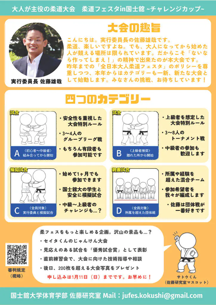 こんにちは。実行委員長の佐藤雄哉です。柔道、楽しいですよね。でも、大人になってから始めた人が競える場所は限られています。だからこそ『ないなら作ってしまえ!』の精神で出来たのが本大会です。昨年までの「全日本大人柔道フェスタ」のポリシーを尊重しつつ、本年からはカテゴリーも一新、新たな大会として始動します。みなさんの挑戦、お待ちしています!