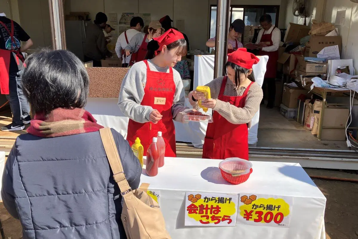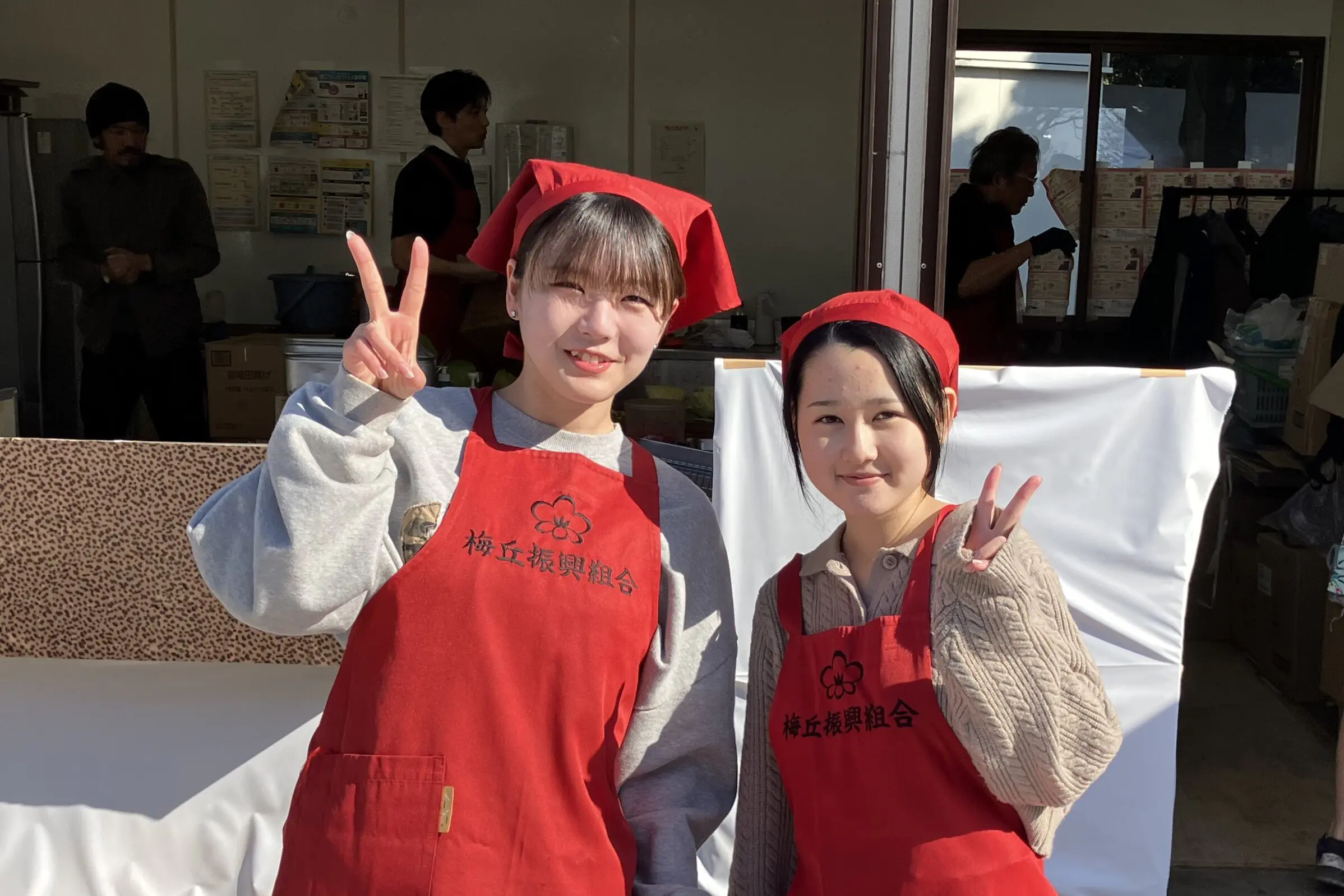 この梅まつりには、近隣の商店街が模擬店を出店し、その1つである梅丘商店街の模擬店での販売・運営などを国士舘大学まちづくり部所属の学生たちが手伝っています。「まちづくり部」(顧問:石見豊政経学部教授)は、まちづくりに携わりたいという思いを持った学生たち約60人が集うサークルです。届出団体として正式に活動を開始するのは4月1日以降ですが、今回のイベントではプレ活動として、希望者のメンバー14人が関わっています。