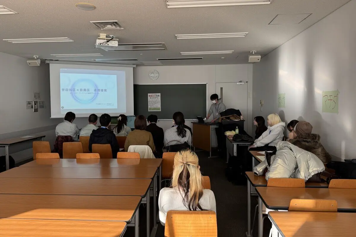 国士舘大学政経学部では、帝京平成大学との合同によるSDGs教育プロジェクト「食品ロス対策の秘密を聞き出せ!」を2025年度に実施しました。本プロジェクトは、食品ロス問題に取り組む自治体・社会福祉協議会・環境NPO・フードシェアリング事業者に対し、学生が直接インタビュー調査を行い、現場の課題や成功の秘訣を学ぶ実践型の取り組みです。春期の調査を踏まえ、秋期には団体間の“連携”をテーマに、学生が新しい協働モデルを提案し、自治体担当者との交流を通じてその可能性を探りました。