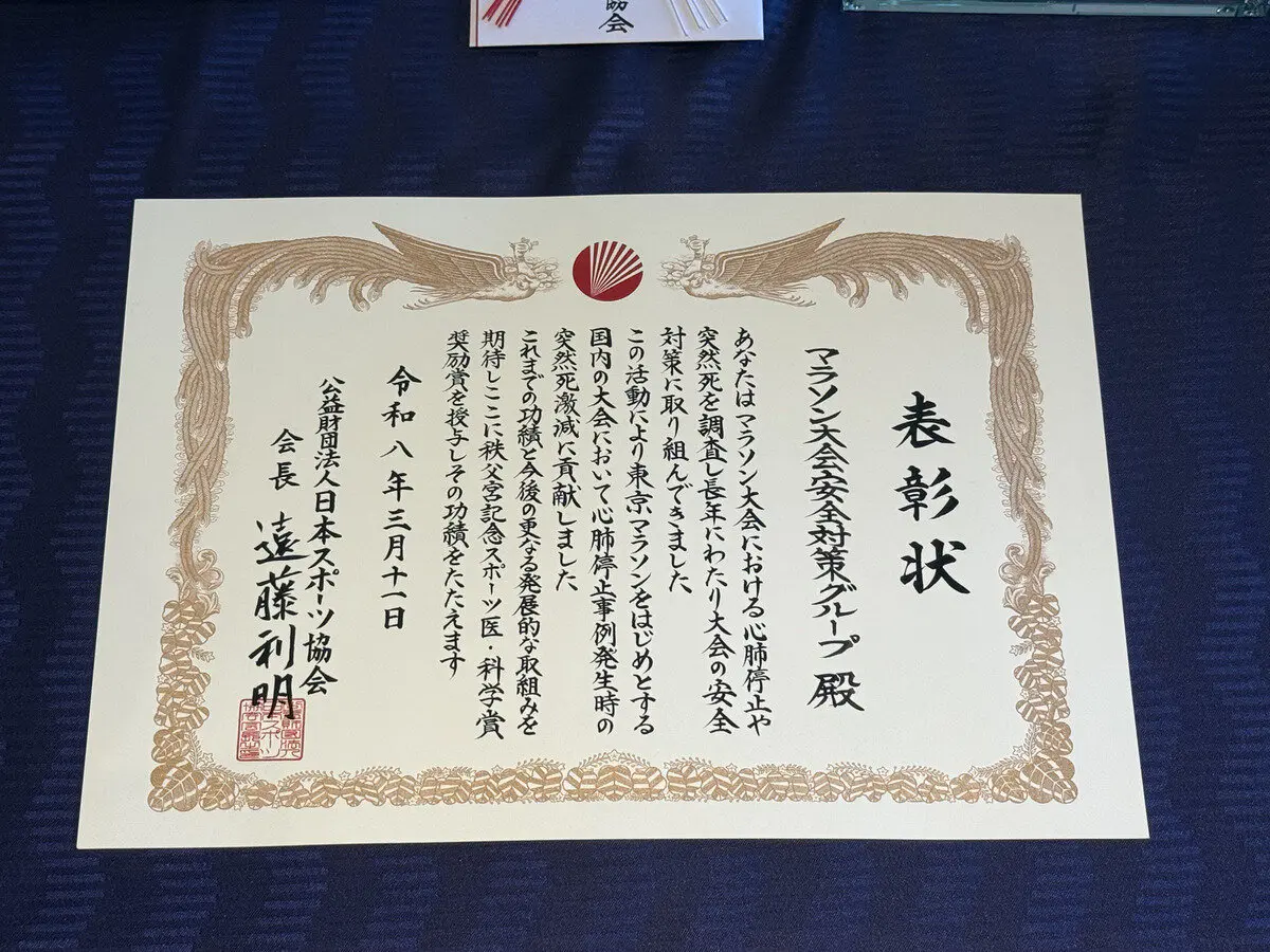 今回は、同グループが20年以上の長きにわたり安全対策に取り組む継続性、東京マラソンをはじめとする国内のマラソン大会における心肺停止事例発生時の突然死減少への寄与、活動を通じて全国各地で開催されるマラソン大会の医療体制・危機管理体制のレベルアップに貢献していることなどが評価されて受賞に至りました。
