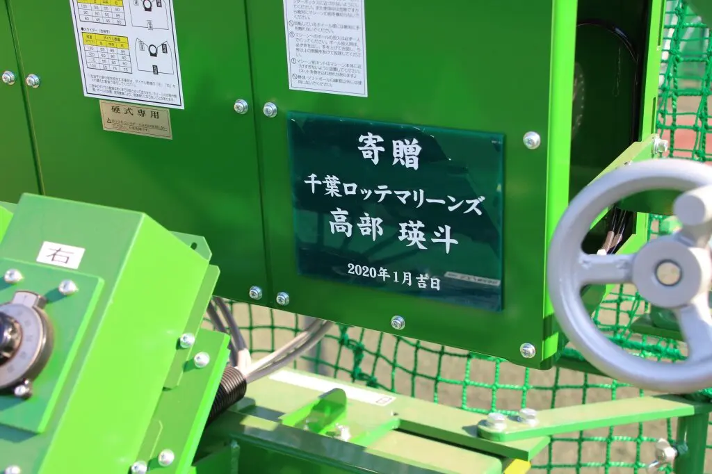 昨年11月のプロ野球ドラフト会議で千葉ロッテマリーンズから3位指名を受け、同球団に入団した髙部瑛斗選手から本学にバッティングマシンが寄贈されました。