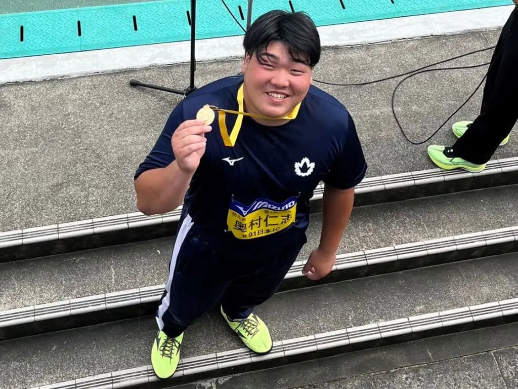 9月11日から13日にかけて、第91回日本学生陸上競技対校選手権大会が京都・たけびしスタジアムで開催され、砲丸投に出場した奥村仁志選手(体育4年)が初優勝を果たしました。