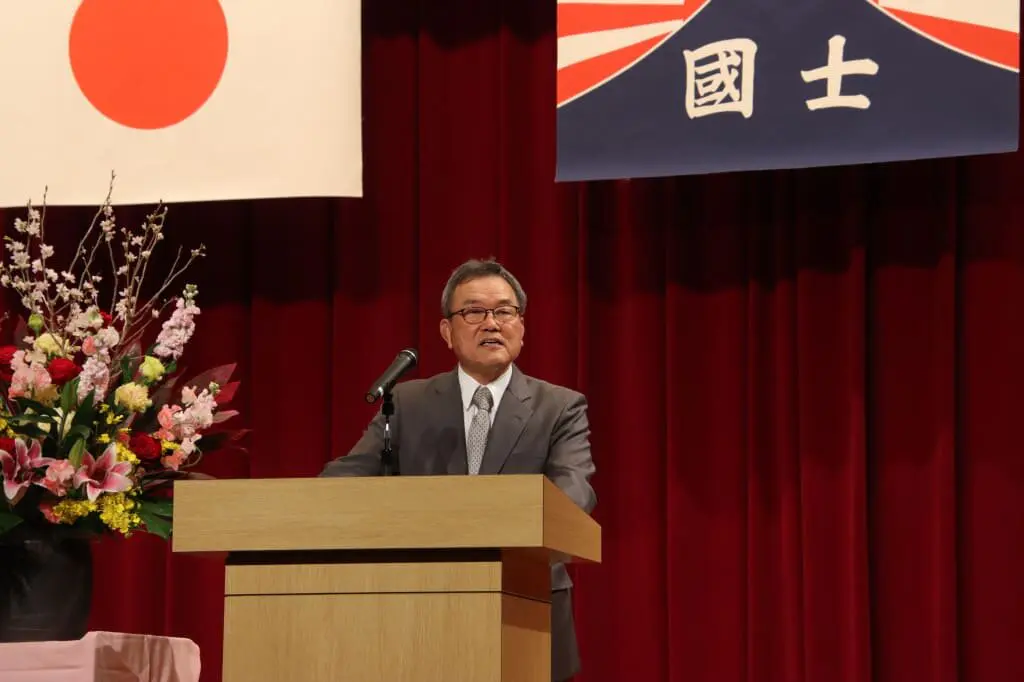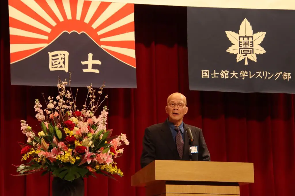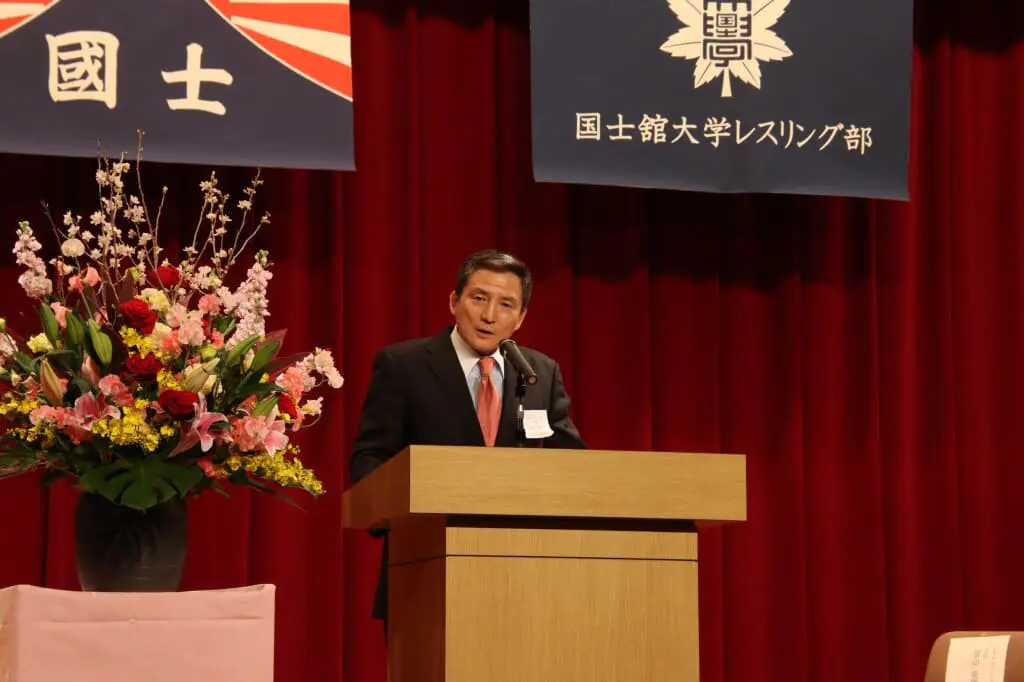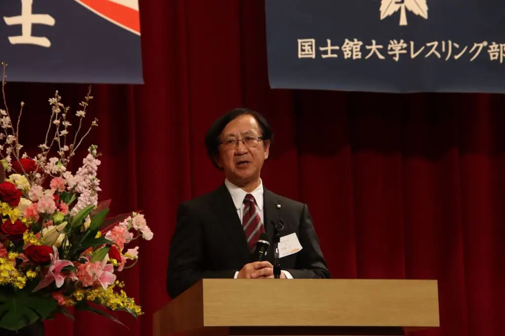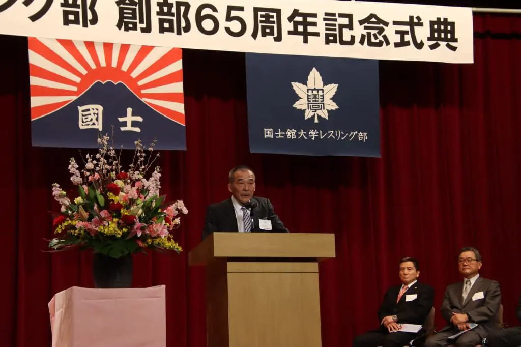 記念式典は、中央図書館地下1階の多目的ホールで行われ、レスリング部関係物故者への黙とうおよび国家斉唱の後、レスリング部の朝倉利夫部長(20期)が主催者を代表し謝辞を述べました。続く祝辞では、学校法人国士舘・大澤英雄理事長、国士舘大学・佐藤圭一学長がそれぞれ、同部の歴史をひも解いてレスリング部が本学にもたらした功績を紹介するとともに、世界で戦う選手の育成に期待を寄せました。引き続き日本レスリング協会の富山英明会長、全日本学生連盟の福田耕治会長、本学レスリング部OBOG会代表・岡唯勝氏(8期)が祝意を述べ、最後に同部65期主将の目黒優太さん(体4年)が抱負と謝意を述べました。締めくくりに列席者全員で国士舘舘歌を斉唱し、閉会しました。