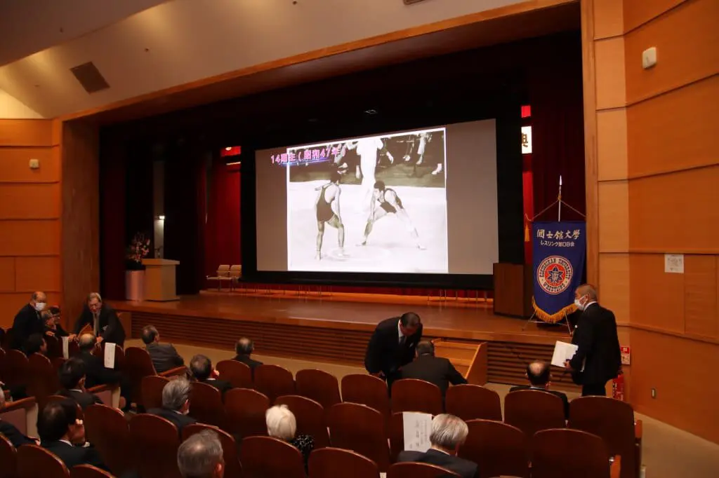 会場には、モントリオール五輪フリースタイル68キロ級銅メダリストの菅原弥三郎氏(昭和50年体育学部卒・16期)も駆けつけ、在学中の思い出を語るなど同部の発展をけん引した卒業生の話に列席者らは熱心に耳を傾けていました。