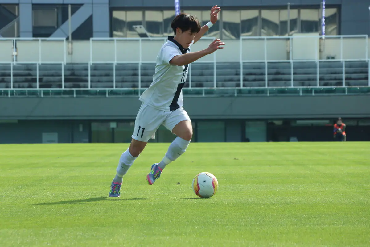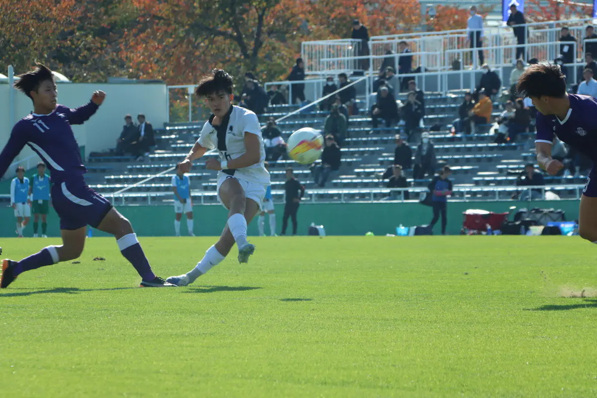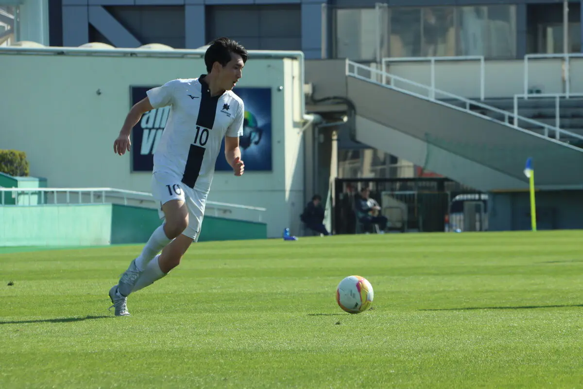 試合開始直後から、須藤太一選手(体育4年)らFW陣の積極的な攻撃でペースを掴むと、19分に小西修斗選手(同3年)のゴールで先制。「あの形でパスをもらえたら決める自信しかなかった」と振り返るコンビネーションプレーからの得点が決まり、1-0で前半を折り返します。