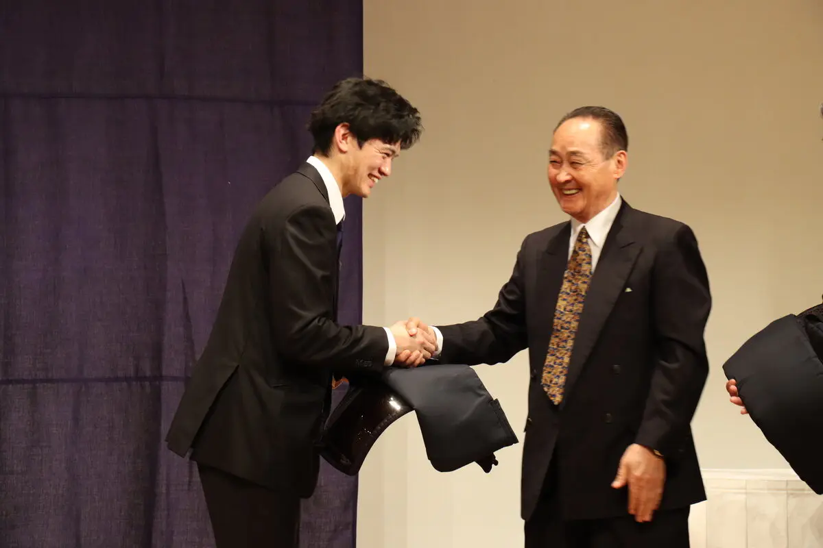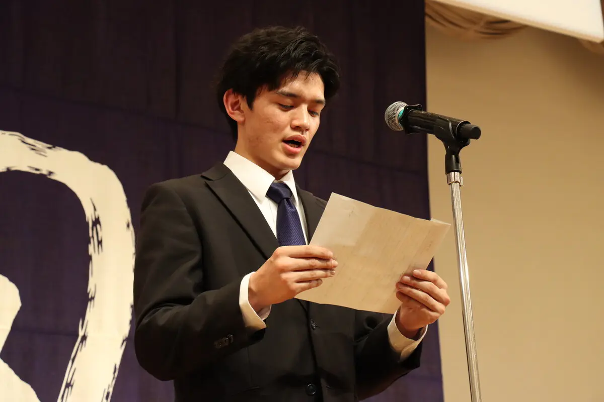 最後に、剣道部主将の中田竜之介選手(体育4年)があいさつに立ち、「4年間を振り返り、厳しい稽古を通じて技術だけでなく心身ともに成長できた」と語り、祝賀会開催の御礼とより一層の躍進に向けた決意を述べ、「国士舘で学んだ剣道の本質と普遍の価値を忘れることなく、新たな舞台でも貢献していく」と、力強く語りました。