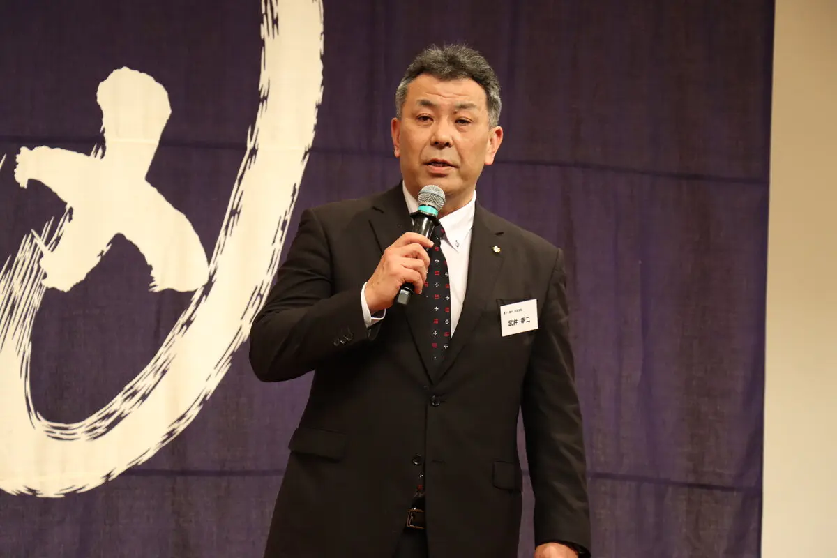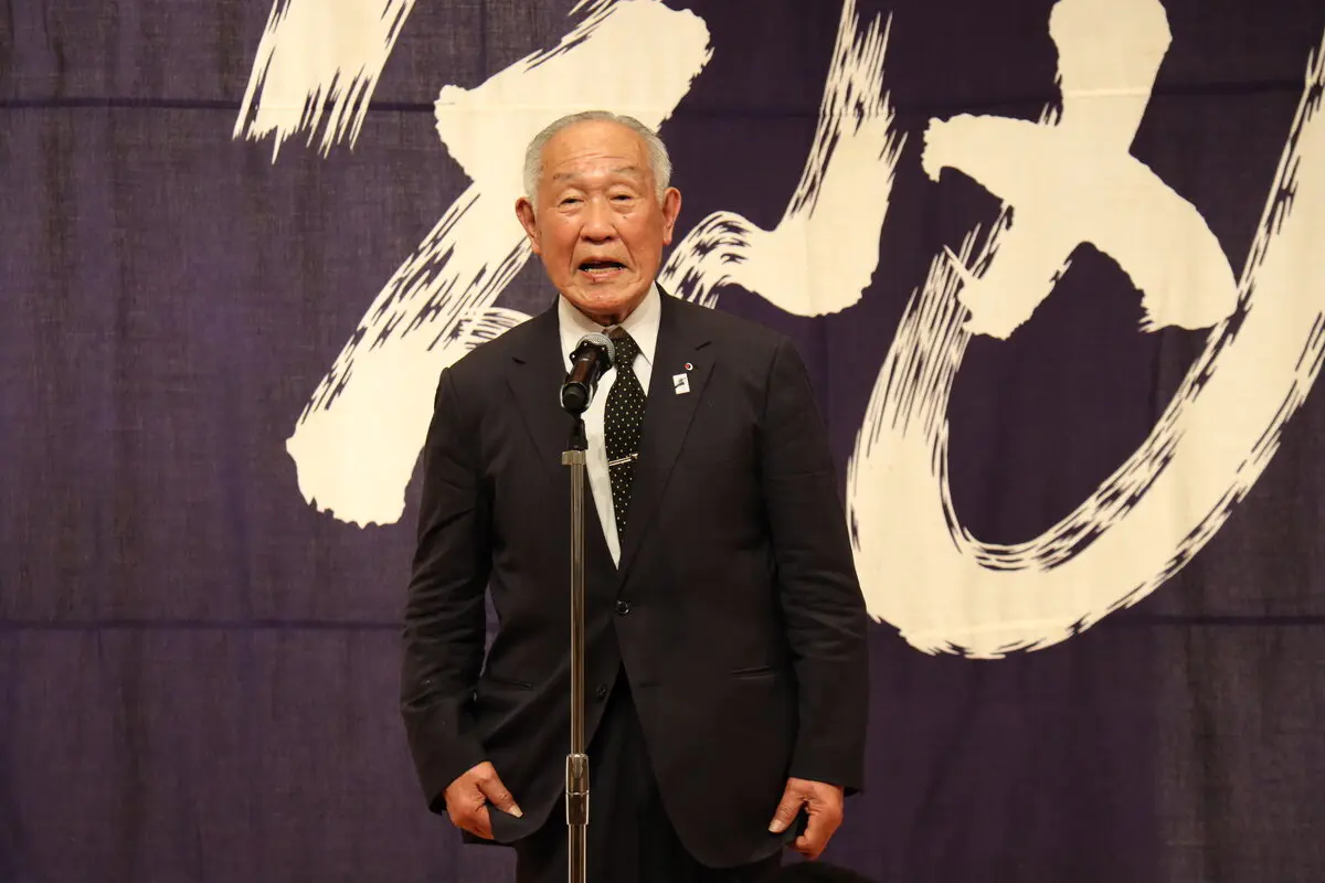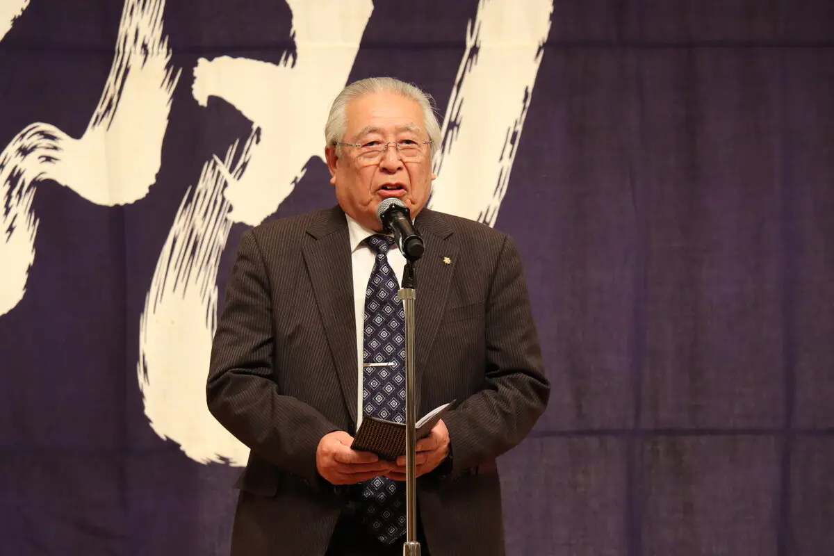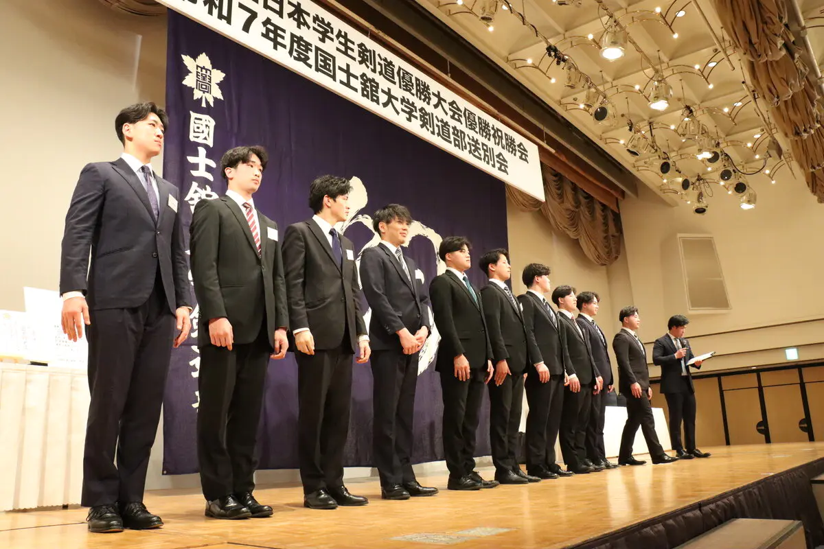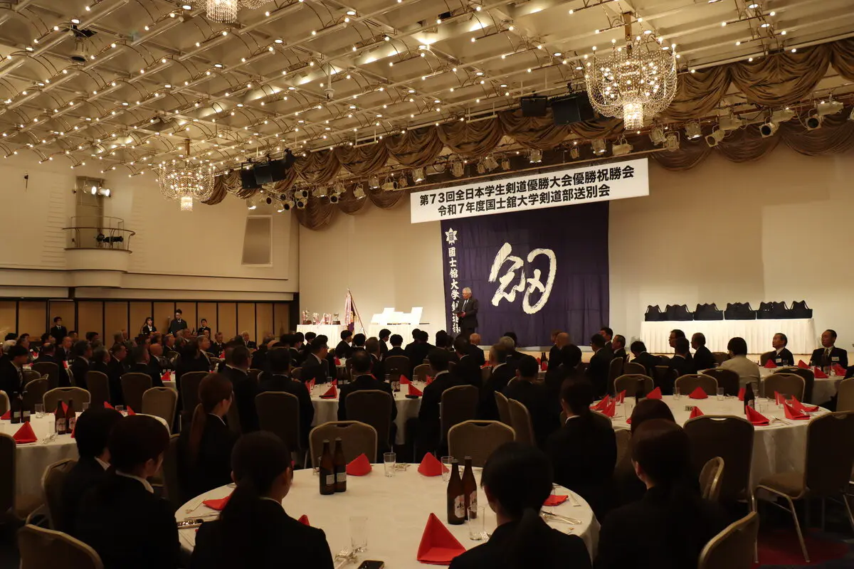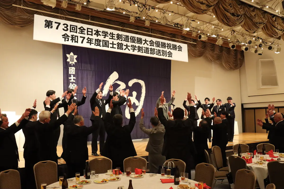 開会にあたり、剣道部部長の右田重昭体育学部教授があいさつを述べ「この優勝は、選手だけでなく、指導者、先輩方、そして学生全員の力が合わさった結果である」と述べました。右田教授は今年度で教員の職を辞することについて触れ「新体制の剣道部においても連覇を成し遂げてくれることを期待している」と、次世代への期待を語りました。来賓祝辞では学校法人国士舘・瀬野隆理事長、国士舘大学・田原淳子学長、関東学生剣道連盟会長・佐野成明氏らがそれぞれ祝辞を述べました。