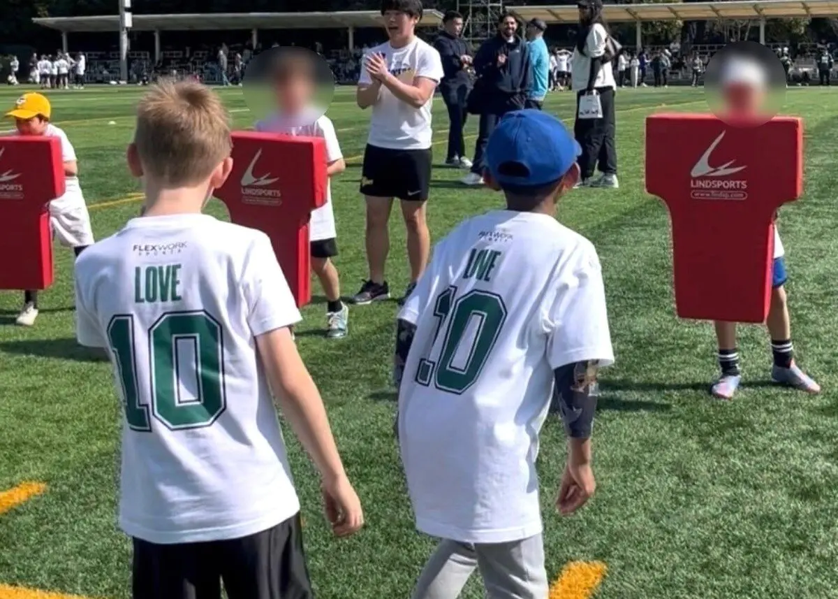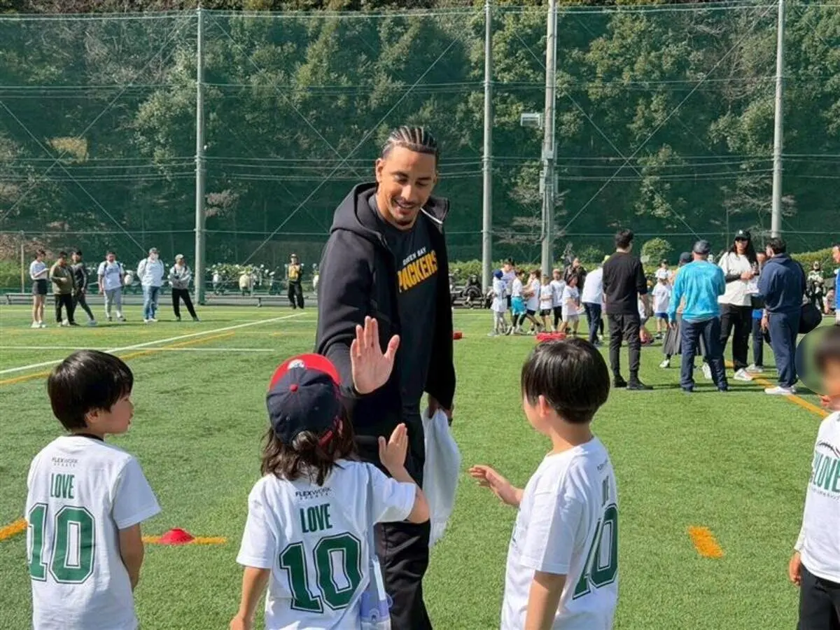 快晴の下で行われたフットボールクリニックには、国内外の子どもたち約300人が参加し、スーパースター選手に目を輝かせながらランやパスなどさまざまなドリルに取り組みました。
