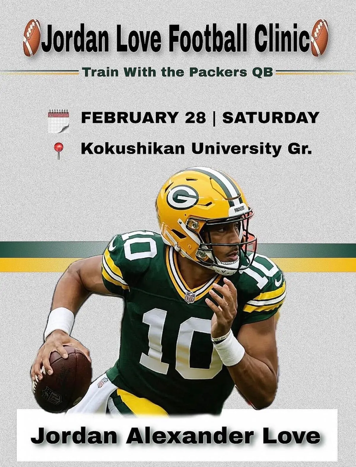 2月28日、多摩キャンパスラグビー・アメリカンフットボール場において、NFL(ナショナルフットボールリーグ)グリーンベイ・パッカーズに所属するジョーダン・ラブ選手による16歳以下のユース世代の子どもらを対象にしたフットボールクリニックが開催されました。